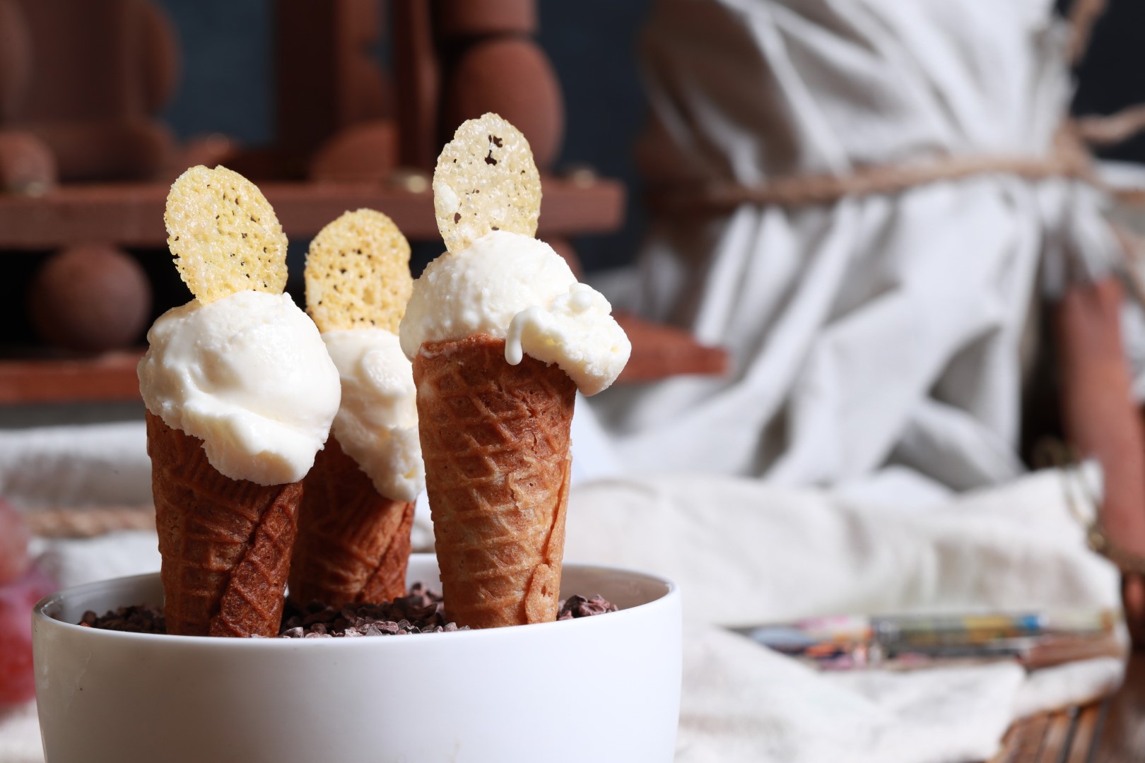 De etalage gevuld met de meesterlijke producten, blies de examencommissie omver. SVH Meesterijsbereiders Jacqueline Hilders (IJscafé Da Benito in Haarlem) en Luc Blok (Luciano’s IJssalons), en Hanneke Westland (secretaris SVH Meestertitels) vergaapten zich aan de rijkdom die op tafel aangeboden werd. Met passende muziek op de achtergrond waanden de beoordelaars zich nouveau riche, zich te goed doend aan de wereld van cacao die Hidde presenteerde. “Alsof je een hap uit een kunstwerk neemt.”